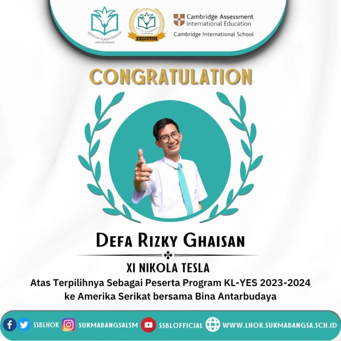 JALANTENGAH.COLHOKSEUMAWE, Ketua OSIS SMA Sukma Bangsa Lhokseumawe, Defa Rizky Ghaisan, berhasil meraih satu tiket Kennedy Lugar Youth Exhange and Study ke Amerika Serikat.