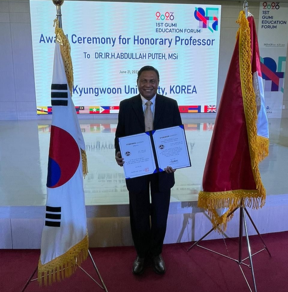 JALANTENGAH.CO I KOREA SELATAN, Anggota Dewan Perwakilan Daerah Republik Indonesia asal daerah pemilihan provinsi Aceh, Dr. Ir. Abdullah Puteh, M.Si menerima penganugerahan Gelar Professor Kehormatan, dari Kyungwoon University, Korea Selatan, Rabu (21/6/2023).
