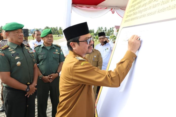 Para pejabat membubuhi tanda tangan di atas lembaran baliho/spanduk sebagai wujud komitmen bersama atau Pakta Integritas untuk menjaga netralitas dalam pelaksanaan Pemilu tahun 2024.