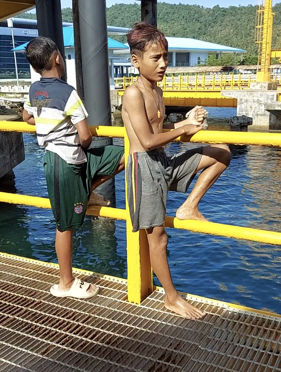 Fairul (12 tahun/tanpa baju) bersama teman ‘aneuk laot’ saat menunggu tantangan menyelam dan menemukan uang yang dilemparkan oleh penumpang kapal di pelabuhan Balohan Sabang.