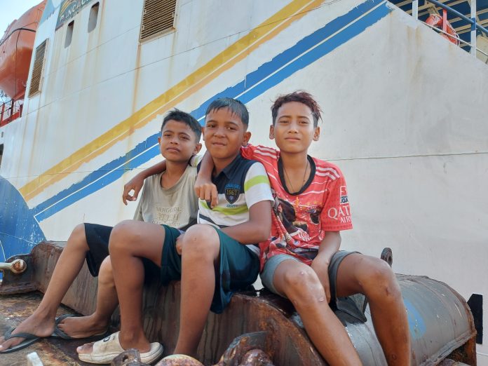 Fairul (12 tahun/tanpa baju) bersama teman ‘aneuk laot’ saat menunggu tantangan menyelam dan menemukan uang yang dilemparkan oleh penumpang kapal di pelabuhan Balohan Sabang.