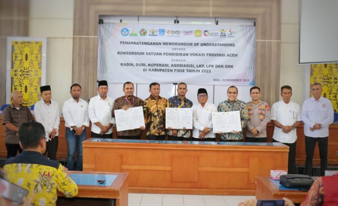 JALANTENGAH.CO I SIGLI – Untuk memperkuat kemitraan Vokasi Aceh, Pemerintah Kabupaten Pidie bersama Kadin Pidie mengundang Konsorsium Pendidikan Tinggi Vokasi Aceh menandatangani Memorandum of Understanding (MoU) dengan Kadin Pidie, DUDI, Asosiasi, Koperasi, LKP, LPK, dan SMK di oproom Setdakab Pidie, Jum’at (22/12/2023).