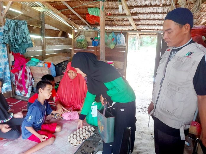 Tepat dibawah turunan bukit perkebunan sawit milik salah satu perusahaan, tim Laziskahmi menemui janda dhuafa, kak Suryani (43) bersama tiga anak yatimnya yang tinggal di rumah gubuk berlantai tanah seukuran 3×4 meter, diapit oleh tiga rumah penduduk lainnya disisi kiri dan depan.