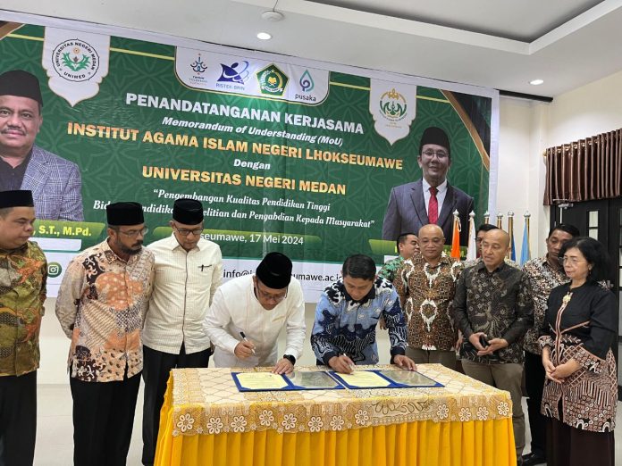 JALANTENGAH.CO I LHOKSEUMAWE – Memperkuat kerjasama di sejumlah bidang akademik, Institut Agama Islam Negeri (IAIN) Lhokseumawe dan Universitas Negeri Medan (UNIMED) menandatangani Nota Kesepahaman di oproom kampus peradaban, Jumat (17/5/2024).