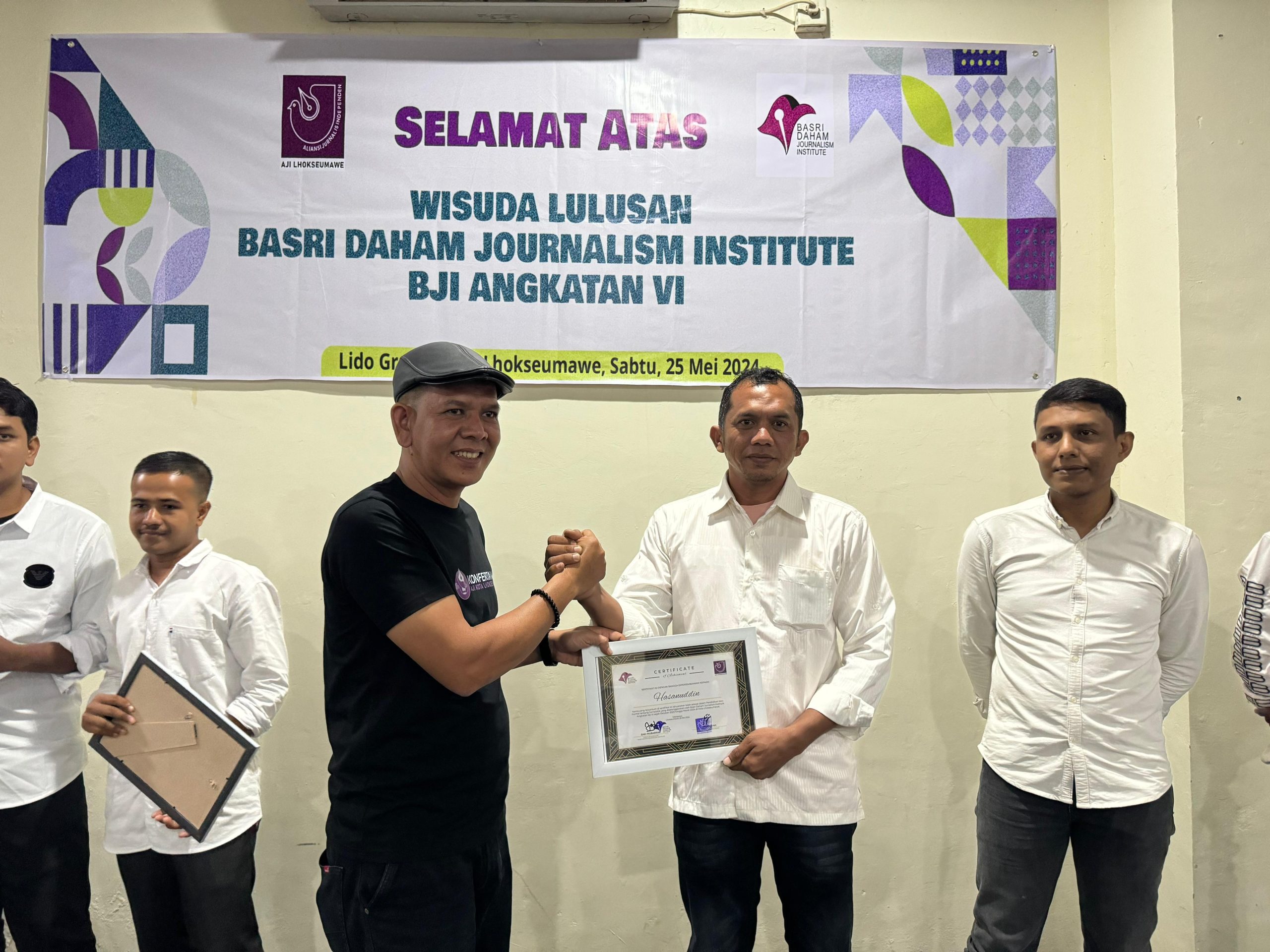 Penyerahan sertifikat kelulusan dilakukan langsung secara simbolis oleh Ketua Aliansi Jurnalis Independen (AJI) Lhokseumawe, Irmansyah, Sekretaris AJI Lhokseumawe, Jafaruddin dan Direktur Eksekutif BJI Lhokseumawe, Zaki Mubarak.