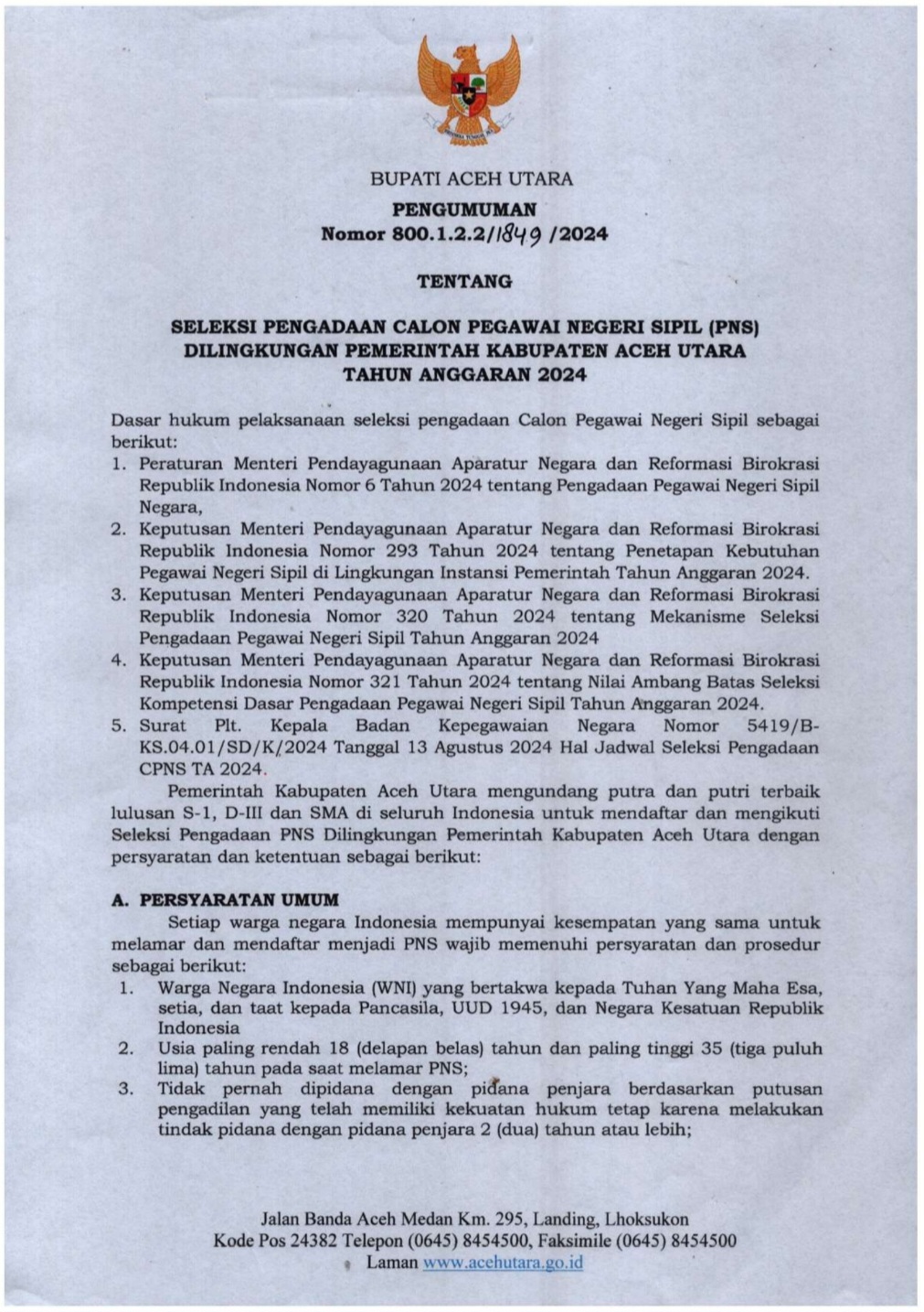 JALANTENGAH.CO I LHOKSUKON – Pemerintah Kabupaten Aceh Utara melalui Kepala BKPSDM Saifuddin, S. STP., MSP menyatakan secara resmi membuka Pendaftaran seleksi calon Pegawai Negeri Sipil (CPNS) Tahun 2024 untuk lulusan S-1, D-3 dan SMA.