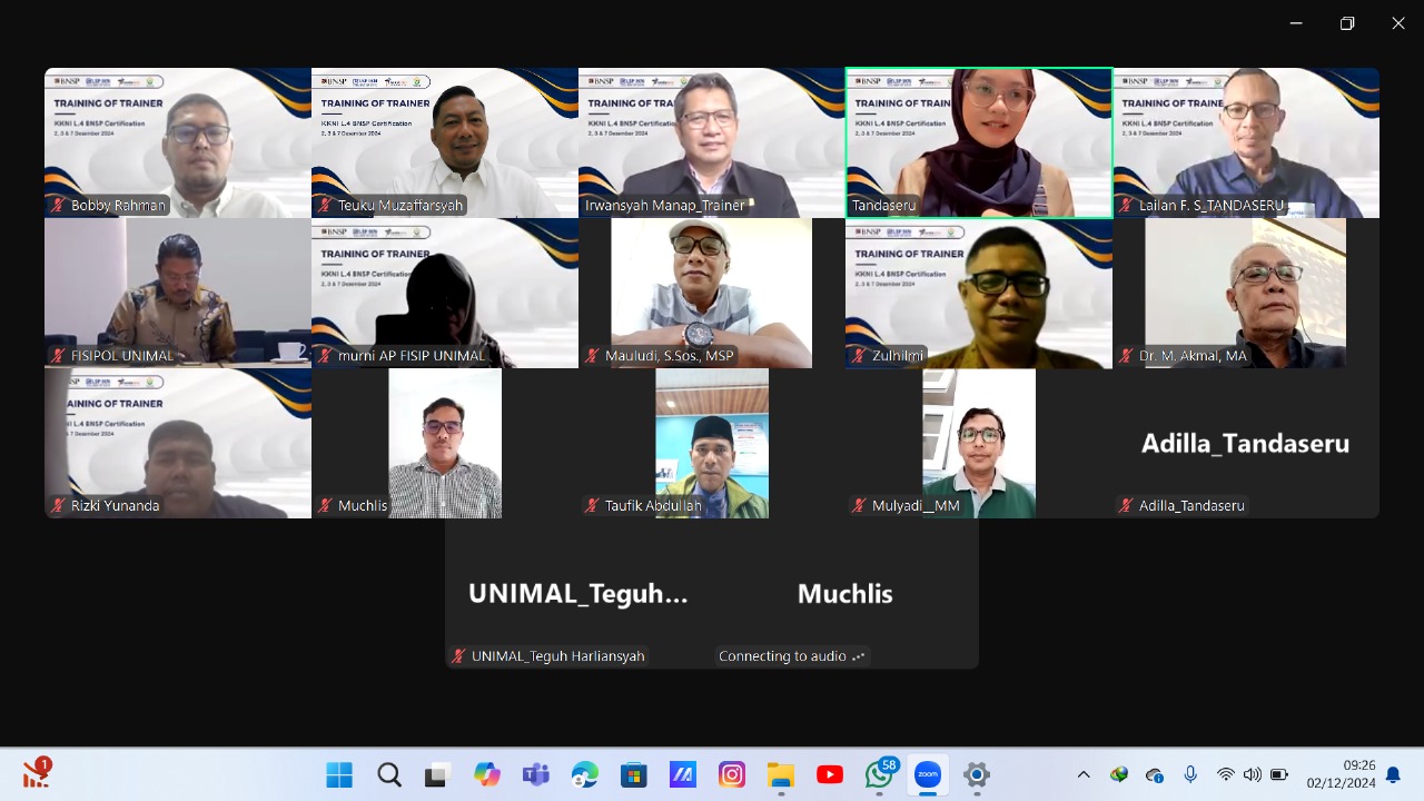 Training ini akan berlangsung mulai hari ini (2/12) dengan tiga tahapan, yakni pelatihan, penyiapan dokumen tugas hingga berakhir dengan sesi uji kompetensi oleh assesor BNSP pada 7 Desember, yang diikuti antusias para dosen FISIP Unimal.