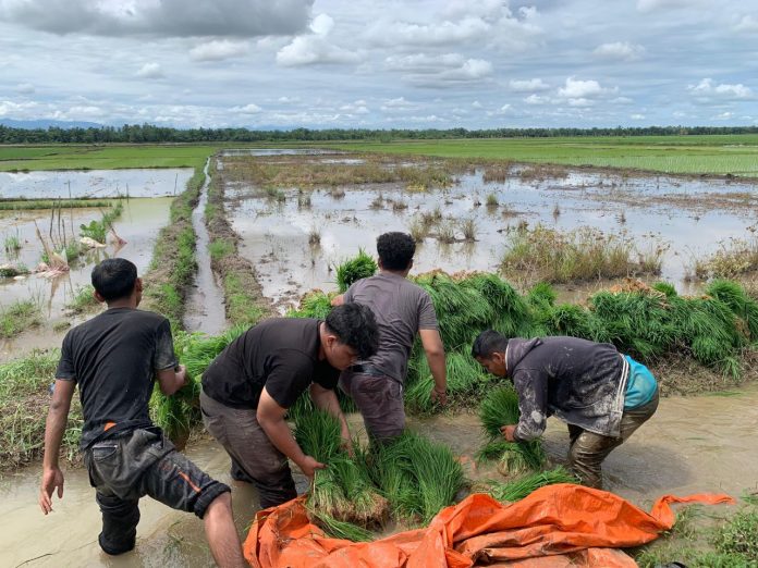 JALANTENGAH.CO I ACEH UTARA – Mahasiswa KKN PPM Angkatan XXXVI Universitas Malikussaleh Kelompok 259 di Gp Cempeudak, Kecamatan Baktiya, Kabupaten Aceh Utara, merealisasikan program ketahanan pangan nasional dengan turut menanam padi di persawahan setempat.