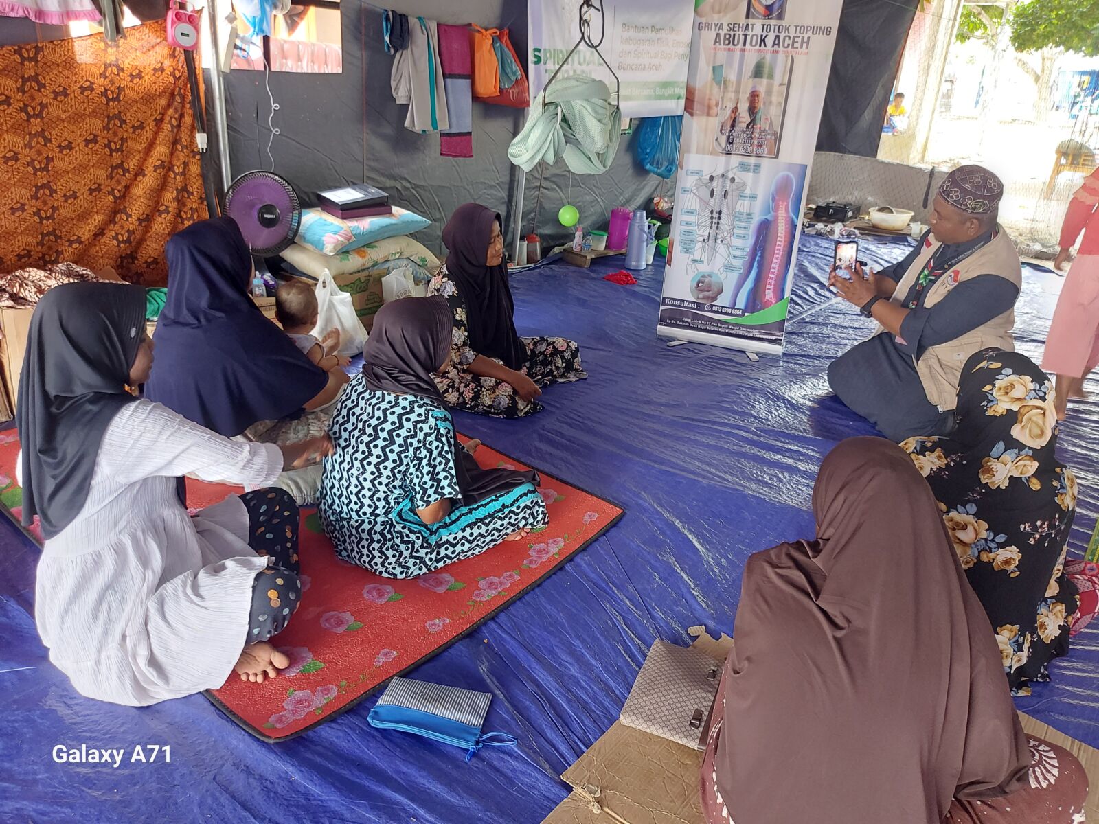 Para penyintas banjir longsor di camp kuala cangkoi, Aceh Utara mendapatkan bantuan spiritual terapi topung untuk pemulihan kebugaran fisik dan emosional pascabencana. (Foto: jalantengah)