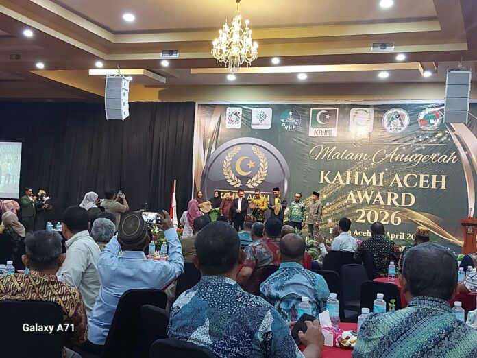 JALANTENGAH I BANDA ACEH – KAHMI Aceh menganugerahkan penghargaan bergengsi kepada Dr. Saifullah Muhammad dalam ajang Malam Anugerah KAHMI Aceh Award 2026 yang digelar di Amel Convention Hall, Kamis malam (16/4/2026).